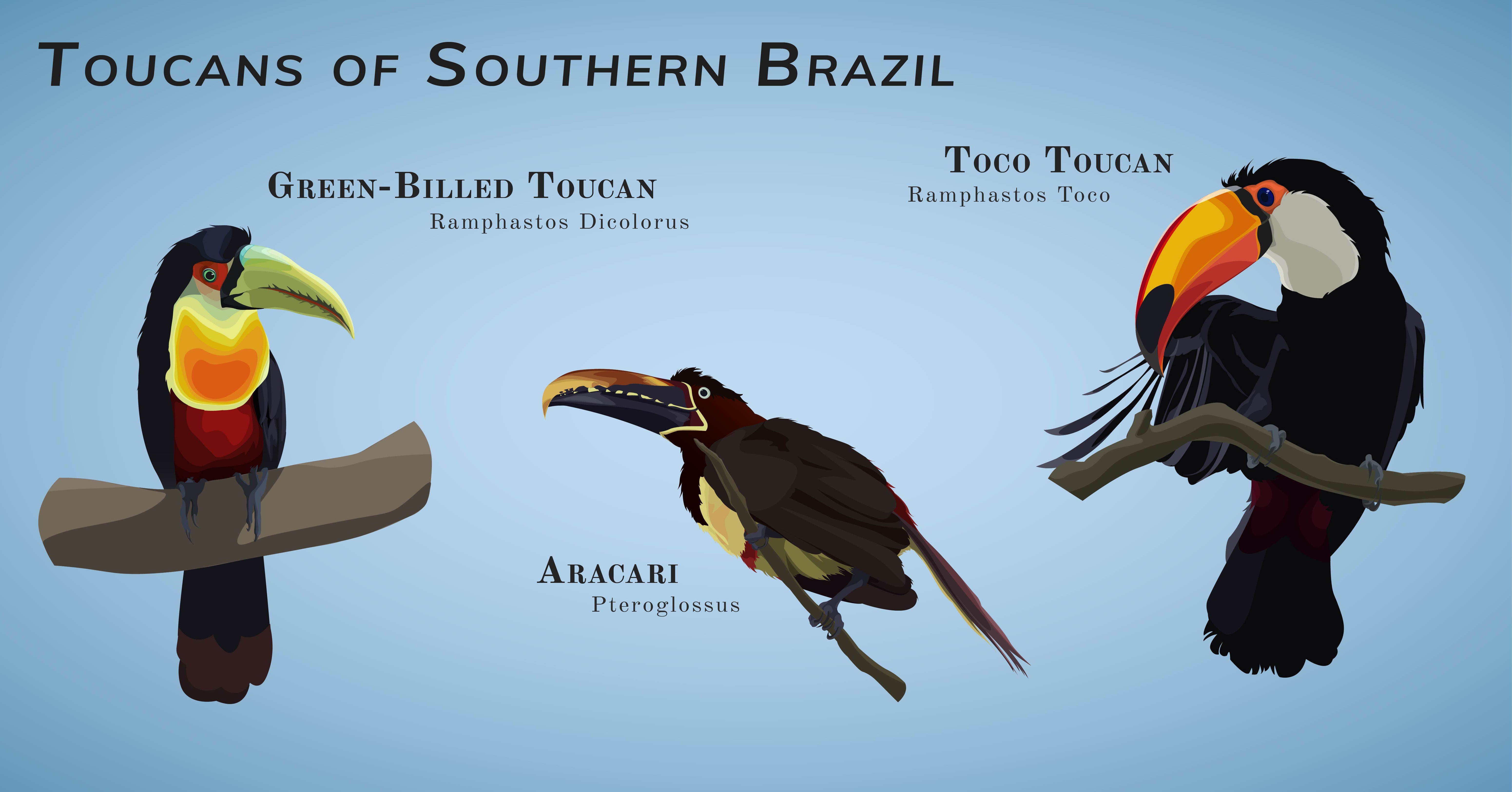 Depending on what the medium of the final piece is to be, I then transfer it to whatever surface the final will be on; in the case of the toucan, I scanned the sketch into the computer to make it into a digital piece. Admittedly there are some media I am still learning, so the process can vary in efficiency, but Adobe Illustrator was my introduction to digital art so I was quite comfortable with it by the time I was putting this piece together. The final piece pictured below includes two other types of toucans that I used the same process stated above in creating.