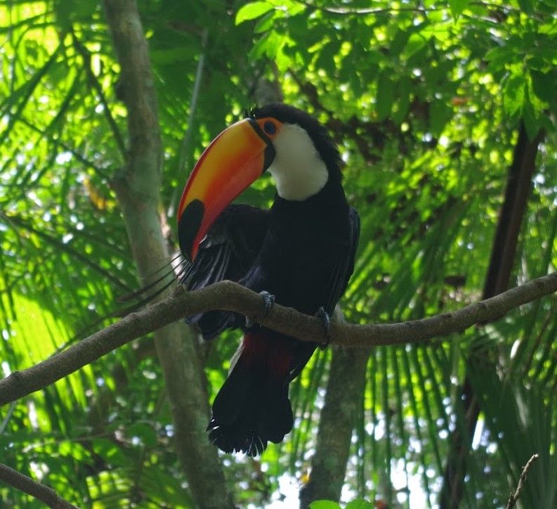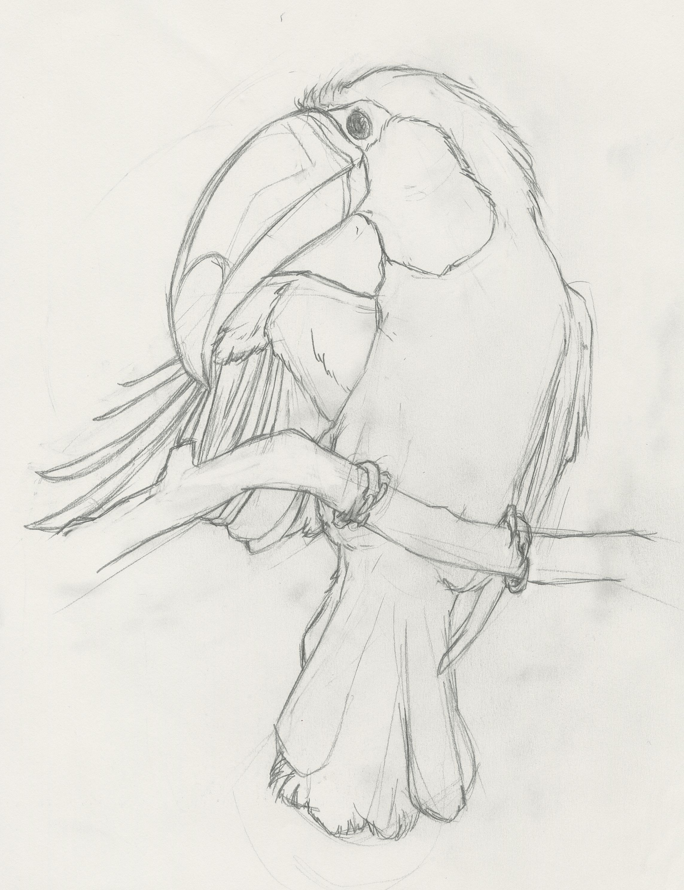 This is a reference photo of a toucan I took on a trip to Foz do Iguaçu in Brazil. The bird was preening at the time so I was able to get a nice dynamic pose from it (this only took about five million consecutive snapshots to get a nice image that wasn’t blurry or difficult to understand). This toucan lived in a bird sanctuary and was already quite accustomed to the presence of humans, so being able to sit and watch from a close distance helped me to understand its calm and confident demeanor. I then transferred this image into the following sketch to use for my “Toucans of Southern Brazil” piece, you can see the rest of the photos and sketches here. I enjoy the sketching part of my process quite a lot, because it requires attention and problem-solving to understand what it is you’re seeing in the photo and translating that into something someone else is able to understand as well.